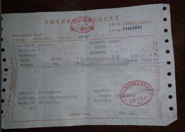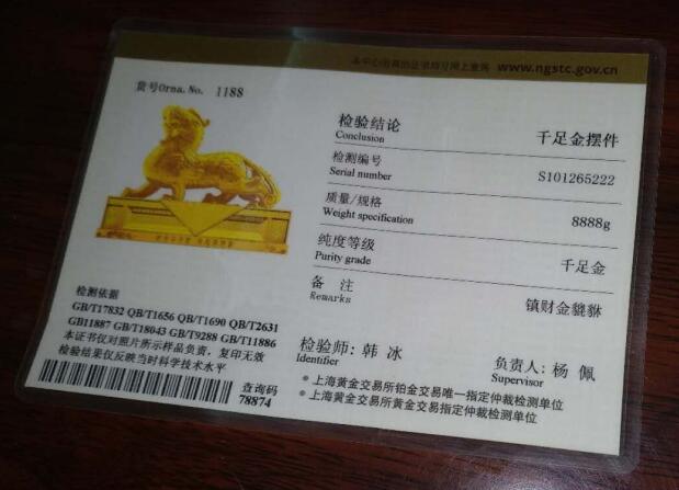 一、拍卖标的:镇财金貔貅千足金摆件一件,质量约8888克,原购于中国银行股份有限公司安庆分行(见发票),经国家金银制品质量监督检验中心(南京)鉴定为千足金(附鉴定证书),起拍价398万元,加价幅度:1万元或其整倍数。竞买保证金50万元。