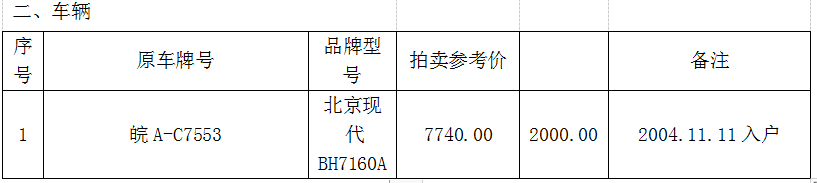5、皖A-C7553北京现代BH7160A旧机动车一辆(详见安徽盛佳拍卖公司网站http://www.ahauction.net/拍卖文件)。