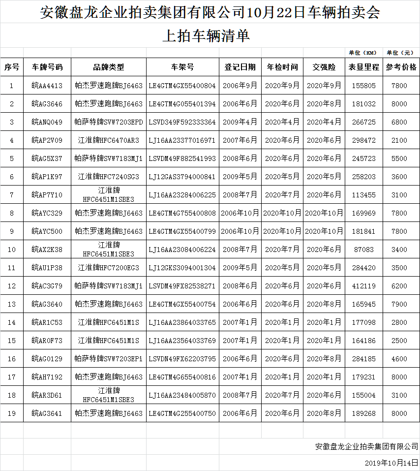 受委托,我公司定于2019年10月22日上午10时在中拍协网络拍卖平台(https://paimai.caa123.org.cn)进行车辆网络专场拍卖会,现公告如下: