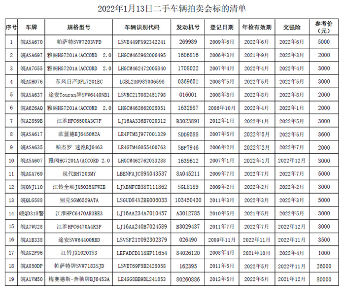 受委托,我公司定于2022年1月13日10时在中国拍卖行业协会网络拍卖平台(网址:https://paimai.caa123.org.cn)举办二手机动车辆拍卖会。具体公告如下:
