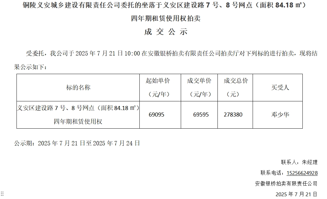 铜陵义安城乡建设有限责任公司委托的坐落于义安区建设路7号、8号网点(面积84.18㎡)四年期租赁使用权拍卖成交公示