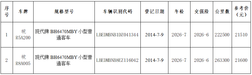 一、拍卖标的:二手机动车一批(2辆),品牌为现代牌汽车,拍卖参考价分别为:21000-22000元。(详见标的清单)