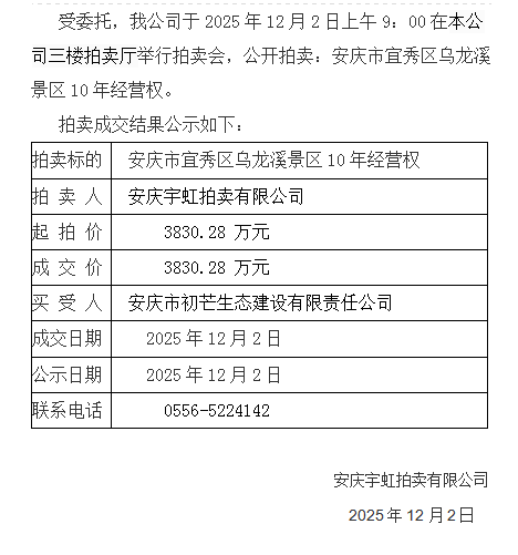 安庆市宜秀区乌龙溪景10年经营权拍卖成交结果公示