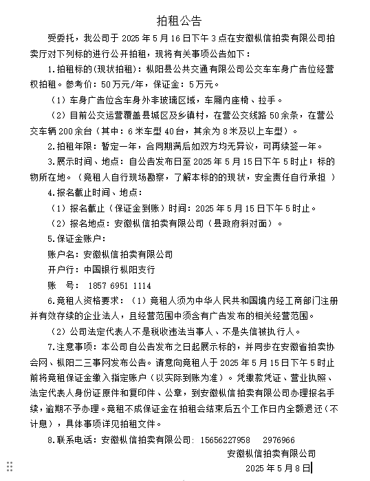 枞阳县公共交通有限公司公交车车身广告位经营权 拍租公告 受委托,我公…