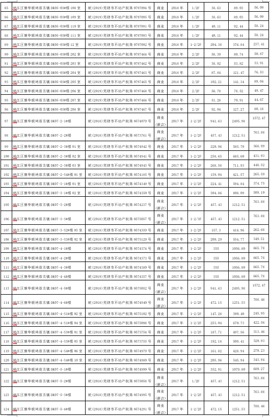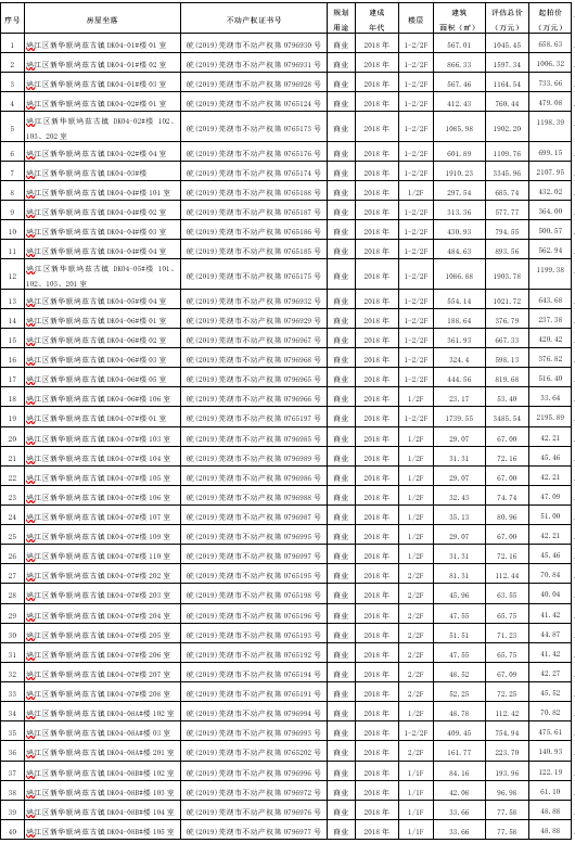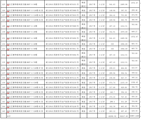 一、本次拍卖标的物:位于芜湖市鸠江区新华联鸠兹古镇145套商业/商业(酒店)用房,建筑总面积:42292.52㎡,钢混,2017-2018年建成,土地使用年限:2054年4月12日止,按证拍卖。明细如下: