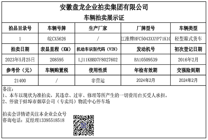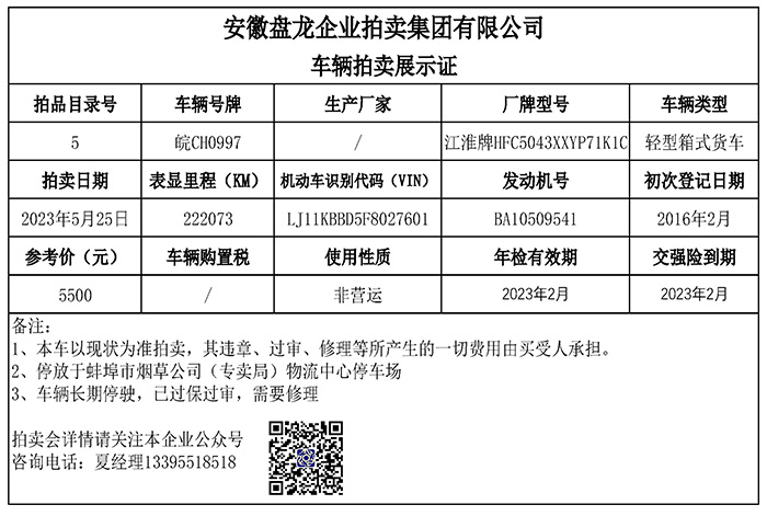 一、标的概况:江淮厢式货车一批,共5台,整包拍卖参考价:9.11万元,详见