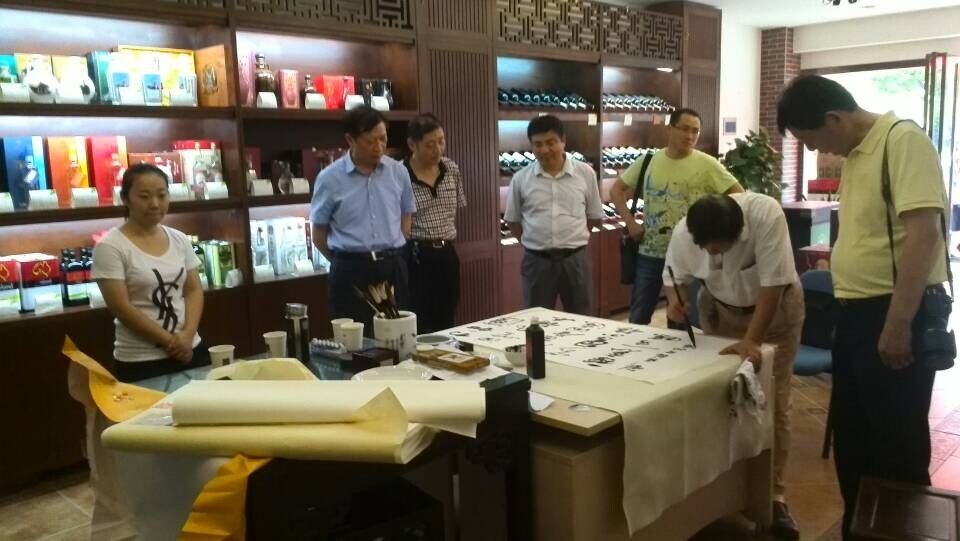 图为(省商务厅领导观看书法家现场创作) 图为(安徽著名书法家阎守江先生现场创作)