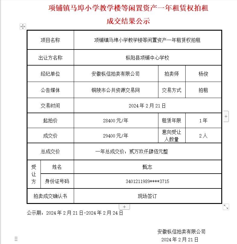 项铺镇马埠小学教学楼等闲置资产一年租赁权拍租成交公示