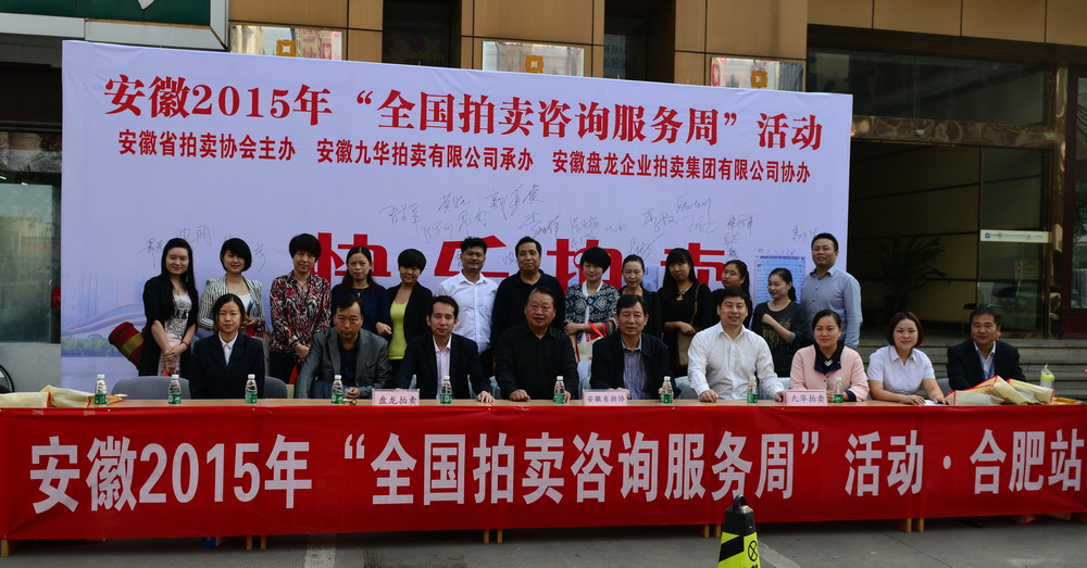 2015年10月24日上午9时许,秋高气爽、风和日丽,在合肥市中心闹区长江中路与桐城路交口,巨幅帷幕上安徽2015年“全国拍卖咨询服务周”活动与“快乐拍卖”等字样在阳光下,熠熠生辉。活动台前,人头攒动。由安徽省拍卖协会主办、安徽九华拍卖有限公司承办、安徽盘龙企业集团拍卖有限公司协办的安徽2015年“全国拍卖咨询服务周”合肥站活动正式拉开帷幕。安徽省拍卖协会会长王恒元、安徽省拍卖协会秘书长杨从军、安徽九华拍卖有限公司总经理李祖祥、安徽盘龙企业集团拍卖有限公司负责人等出席当天的活动。