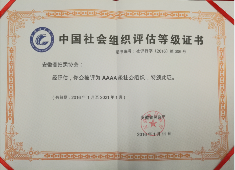 此次荣获“AAAA级”社团组织,是省民政厅和社团组织评审专家组对我会几年来工作成效、组织管理和服务水平等各项工作的充分肯定,也是我会发展道路上的一个重要里程碑,是协会一张重要的信誉名片。这一成绩的取得,离不开各级领导的关心,离不开广大会员单位的支持与配合,更离不开秘书处一班人辛勤努力。协会秘书处决心以此为契机,再接再励、主动作为,进一步端正服务态度,充分发挥桥梁和纽带作用,为我省拍卖行业健康发展作出积极的贡献。(秘书处)