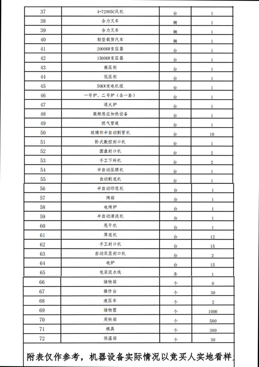 安徽力华光电玻璃科技有限公司房产土地、附属工程、设备及存货,起拍价:1800万元(有保留价,未达到保留价不成交)。拍卖标的物现位于安徽力华光电玻璃科技有限公司厂区内,主要分为土地、建筑物、附属工程、机器设备、办公电子设备及其他和存货。土地、建筑物、附属工程具体信息详见附表一:房地产情况表;机器设备主要包括电控门、自动镀膜机、TVP全自动排气机、一号炉、二号炉等等,详见附表二:机器设备明细表;办公电子设备主要包括空调、电脑、复印机等,详见附表三:电子设备及其他明细表;存货为玻璃管材,型号不一,详见附表四:存货明细表。