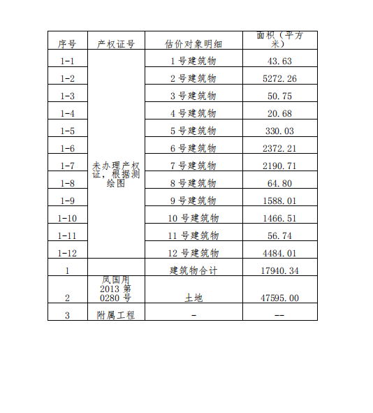 安徽优优反光材料有限公司建筑物、土地和附属工程,起拍价:1190万元(有保留价,未达到保留价不成交)。拍卖标的物现位于安徽优优反光材料有限公司厂区内,主要分为建筑物、土地和附属工程。建筑物主要为企业办公楼和生产厂房,总面积约为17940.34平方米,具体面积以实际现状为准。拍卖土地的土地证号为凤国用2013第0280号,土地面积为47595平方米,约为71.4亩,具体面积以证载为准。附属工程主要为门卫室、厕所等无证建筑。拍卖标的物具体情况请参见附件:拍卖标的物明细表。
