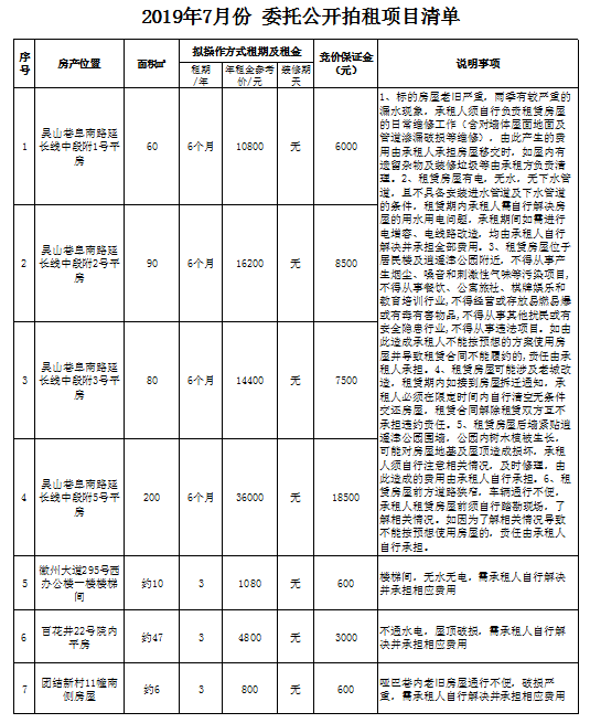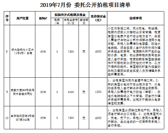 注意事项:以上房屋竞价租赁事宜详见相关文件,有意竞租者于2019年8月1日12时前向指定账户交纳相应保证金(开户行:徽商银行合肥阜阳北路支行;户名:安徽盛佳拍卖有限责任公司;账号:1024801021000064965,以到账为准),并携带相关资料到我公司办理竞租登记手续。