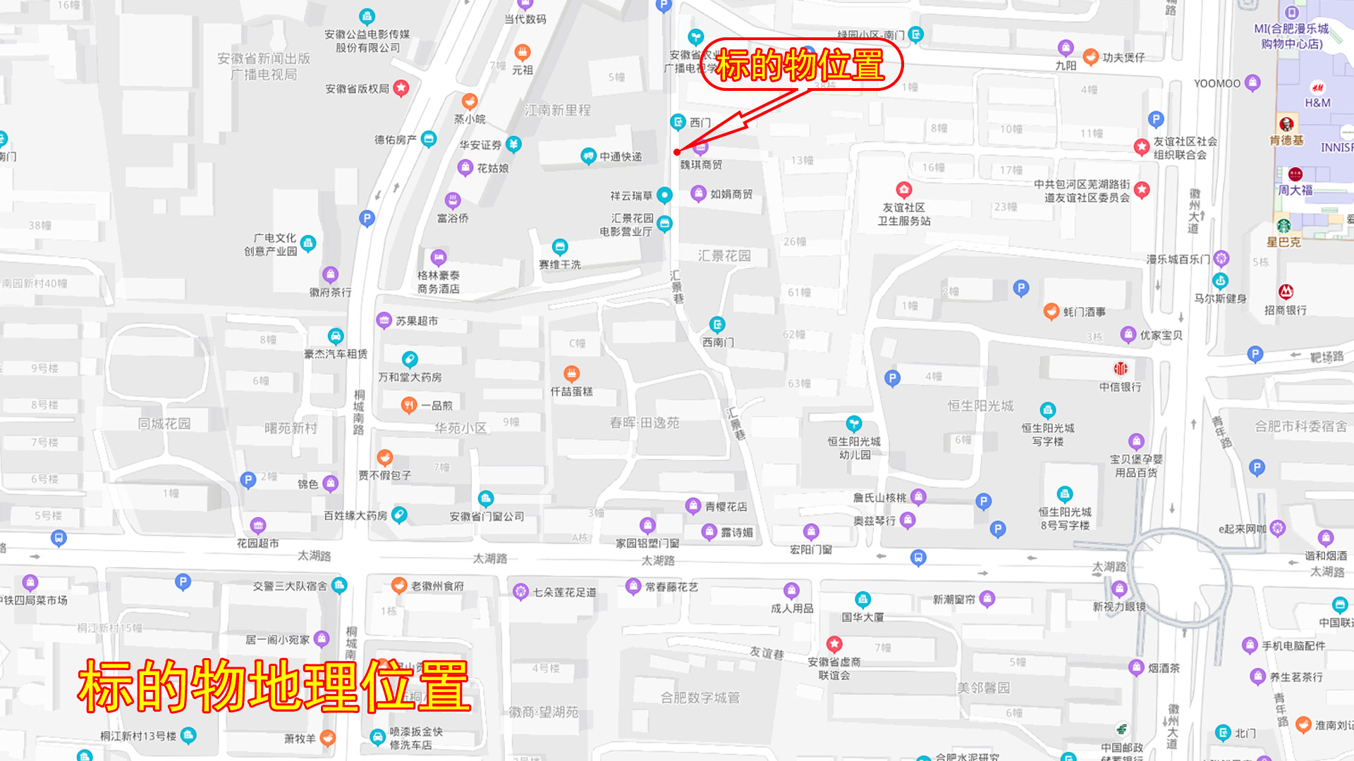 一、本次拍卖标的物:合肥市太湖西路汇景花园9幢101室经营用房(房地产权证:房地权包字第006623号),总建筑面积:45.28平方米,钢混结构,2002年建成,层次/总层数:1/6;评估价总价:256420元,单价5663元/㎡,起拍价:215392元,保证金:2万元,增价幅度:1000元(以及其整倍数)。