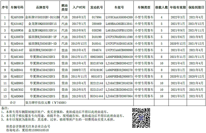 一、标的概况:殡仪服务用车13台打包拍卖(不含车牌),有金杯、华夏、金龙、福田等,拍卖参考价:74500元,详见拍卖清单。本批车辆属殡仪服务专向用途,且座椅不全,专用车辆限制地区转户,现在公告中明确告知,买受人竞得后不得以此理由退车。