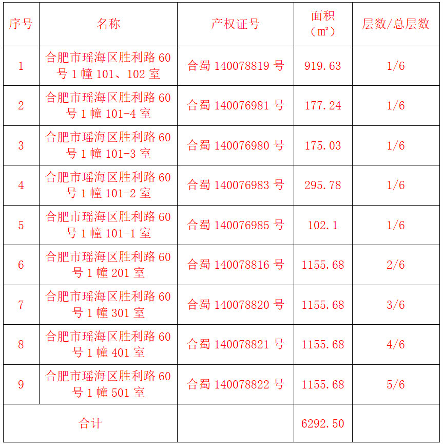 一、本次拍卖标的物:位于合肥市瑶海区胜利路60号1幢9间商业服务房产,建筑面积共计6292.5㎡。(具体详见下表)