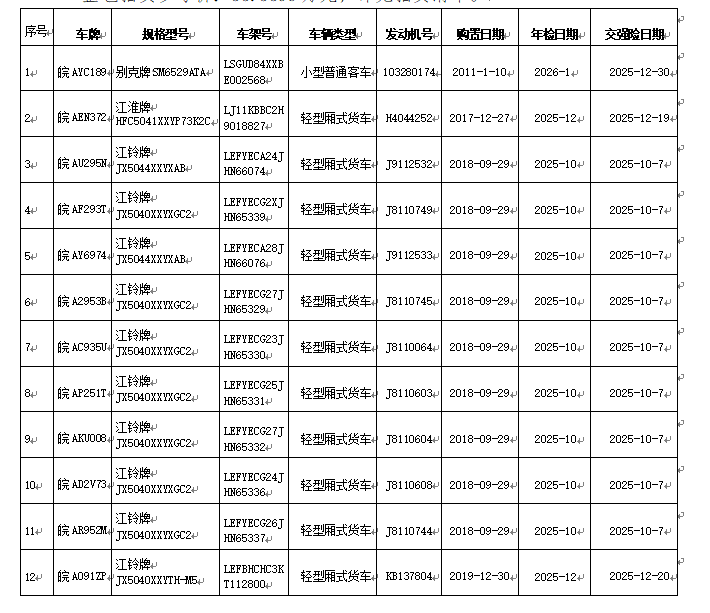 一、标的概况:江淮、江铃厢式货车11台,别克商务车1台,整包拍卖参考价:35.5396万元,详见拍卖清单。