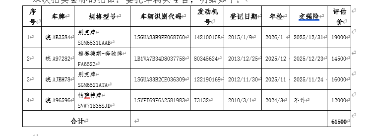 一、标的概况:二手机动车4台,拍卖参考价:1.2万-1.90万元,详见拍卖清单。