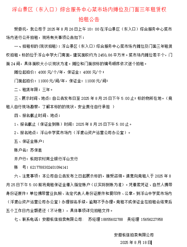 浮山景区(东入口)综合服务中心菜市场内摊位及门面三年租赁权 拍租公告…