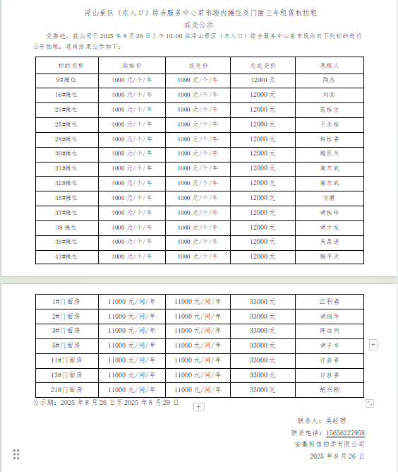 浮山景区(东入口)综合服务中心菜市场内摊位及门面三年租赁权拍租 成交…
