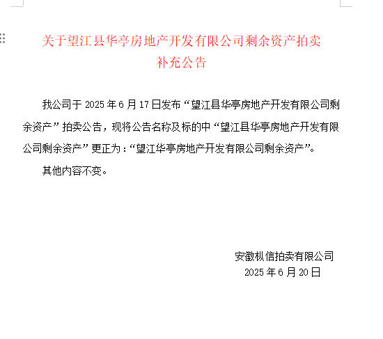 关于望江县华亭房地产开发有限公司剩余资产拍卖 补充公告 …