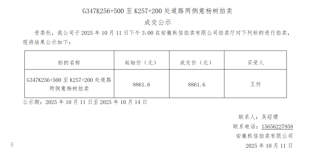 G347K256+500至K257+200处道路两侧意杨树 拍卖公告…