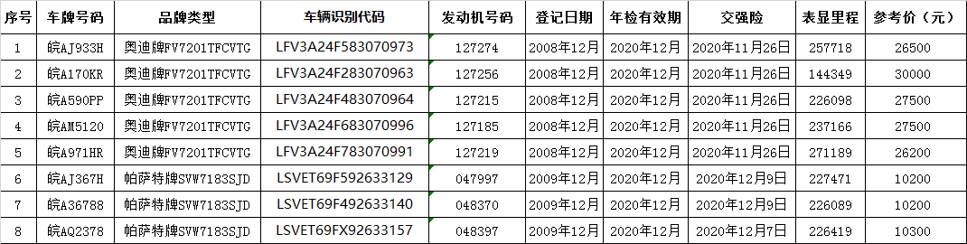 一、标的概况:二手机动车辆一批,共8台(有奥迪、大众等),拍卖参考价:每台1-3万元,详见拍卖目录。