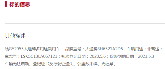 皖GY2955大通牌多用途乘用车一辆,具体以现状为准。拍卖参考价21891元,竞买保证金5000元。