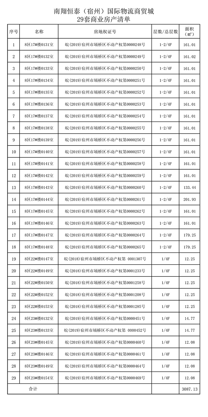 一、本次拍卖标的物:位于宿州市埇桥区城东街道津浦村港口路西侧一宗商服用地国有建设用地使用权及港口路东侧南翔恒泰(宿州)国际物流商贸城29套商业房产。土地证号:皖(2019)宿州市埇桥区不动产权第0002397号,土地面积:64588.02㎡,土地性质:出让,使用期限:2019年7月24日起2059年7月23日止;房产建筑面积共计3087.13㎡,房屋结构:钢混结构,2017、2018年建成。(具体详见下表)