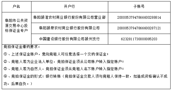 1、报名时间:自公告发布之日起至2026年4月13日17时00分止;竞租人须登录阜阳市公共资源交易系统,完成登录、主体库信息登记、提交资格审查资料、缴纳竞拍保证金等事项,逾期不予办理。
