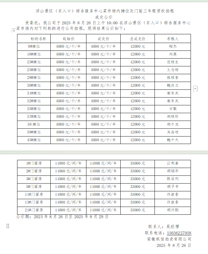 浮山景区(东入口)综合服务中心菜市场内摊位及门面三年租赁权拍租 成交…