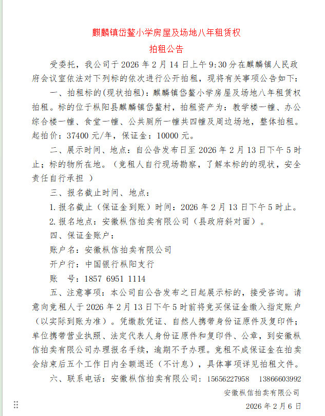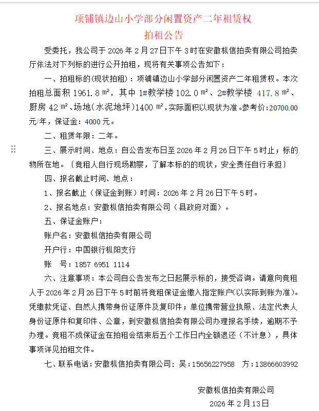 项铺镇边山小学部分闲置资产二年租赁权 拍租公告 受委…