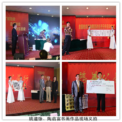 在启动仪式现场,还举行了公益拍卖。安庆市书画院原院长姚道馀、安庆市书画院院长陶启富现场进行了书画表演,并将书画作品现场拍卖,将拍卖所得以安庆市拍卖典当行业协会名义,捐给安庆市宜秀区杨桥镇,支持农村文化公益事业发展.