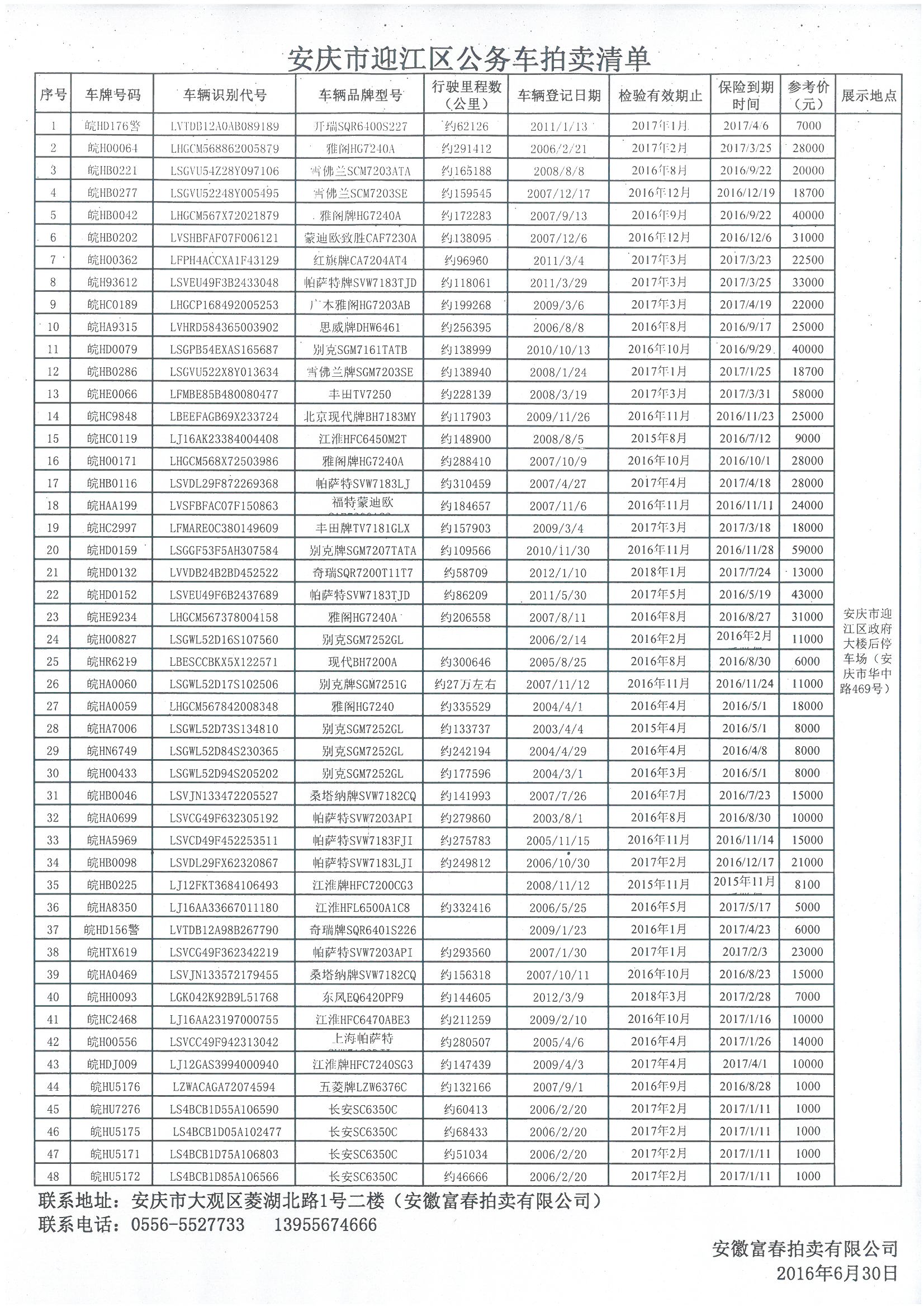 一、拍卖标的(以现状拍卖):安庆市迎江区公务车辆一批(有轿车、越野车、商务车等合计48辆),详见清单。每辆车:竞买保证金5000元,履约保证金5000元。