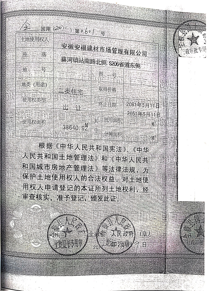 安徽安福建材市场管理有限公司位于全椒县襄河镇站南路北侧、S206省道东侧一宗二类住宅用地及附属物等资产。土地证号:全国用(2011)第0601号;土地面积:38640.92㎡.土地:地类(用途):二类住宅,使用权类型:出让,终止日期:2081年5月11日、2051年5月11日。整体拍卖:参考价:71772047.52元,保证金:720万元。