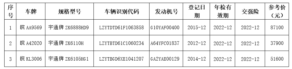 一、标的概况:二手机动车辆一批,为宇通牌客车三台,拍卖参考价:详见拍卖目录。