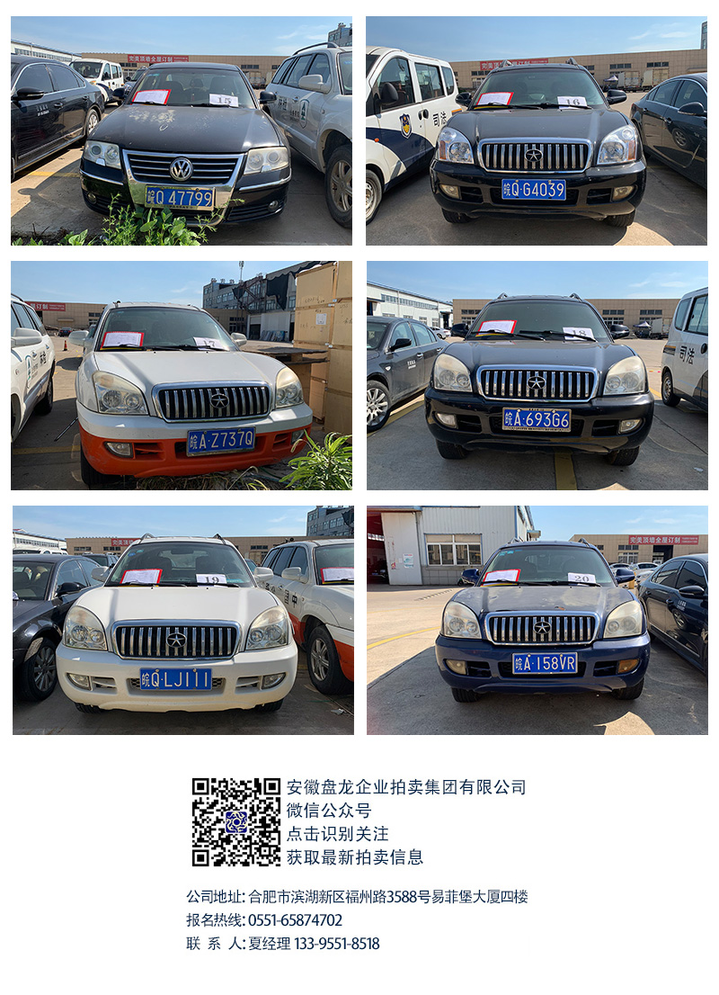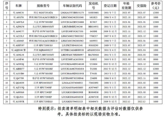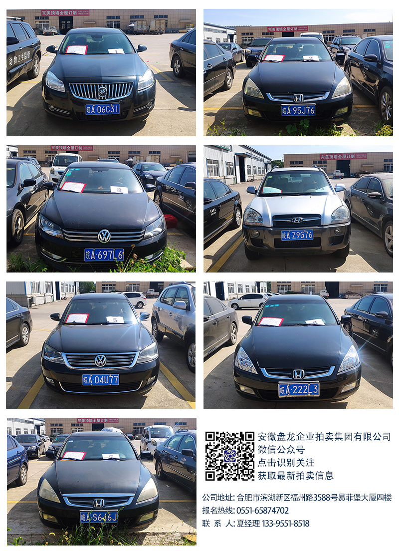 一、标的概况:庐江县更新取消公务用车一批,共20台(本田、别克、江淮、大众、现代等),拍卖参考价:每台1000元-1.2万元不等,详见拍卖清单。