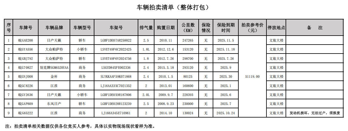 车辆一批,共计9辆,整体打包拍卖。主要车型有江淮、别克、大众、东风日产等,车辆信息详见拍卖清单,具体以现状为准。拍卖参考价51119元,竞买保证金10000元。