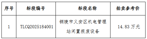 三、基本信息:标的为铜陵市义安区机电管理站闲置报废设备,具体状况以现场现状为准。拍卖参考价14.83万元,竞买保证金2万元。