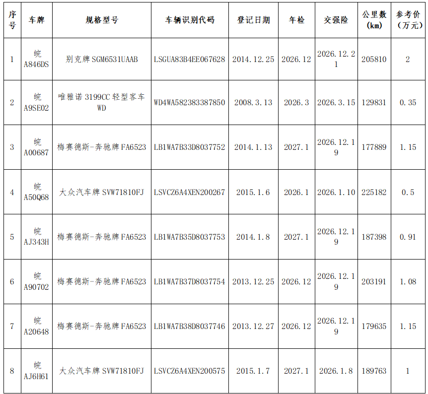 一、拍卖标的:二手机动车一批(8辆),品牌为大众牌、奔驰牌、别克牌汽车,拍卖参考价为:0.3万-2万元。(详见标的清单)