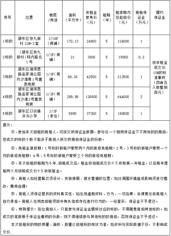 八、特别提示:竞租人竞拍前请务必阅读本公司在阜阳市公共资源交易中心网站发布的《拍租公告》、《竞租须知》等相关拍租交易文件,实地踏勘标的物,一经参拍即视为同意且完全遵守《竞价须知》等拍租交易文件的各项条款并自行承担全部瑕疵风险。